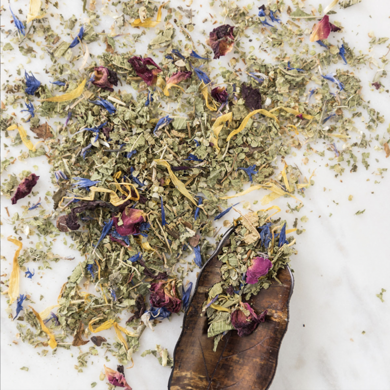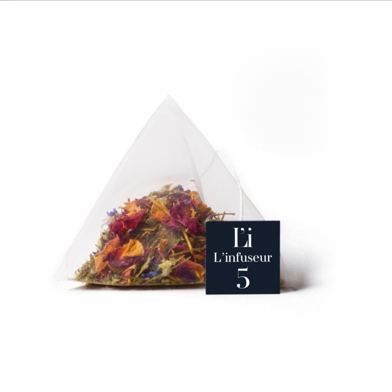 Composition : Verbena, Marjoram, Rose petals, Cacao nibs, Red poppy petals, Red wine, Orange natural flavor, Marigold and cornflower petals.
